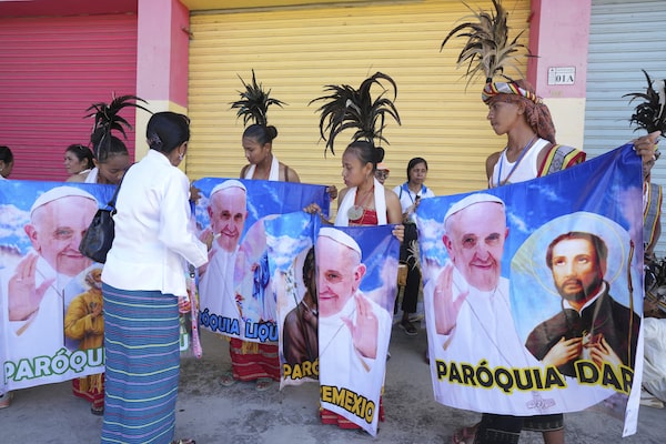 People with traditional dress hold banners of Pope Francis as they prepare to welcome the pope's visit in Dili, East Timor on Sept. 9.Firdia Lisnawati/The Associated Press