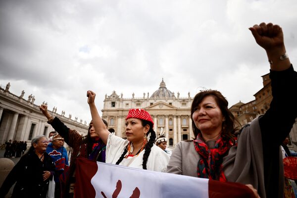 First Nations delegates gesture in St. Peter's Square on April 1 after an audience with Pope Francis.Yara Nardi/Reuters
