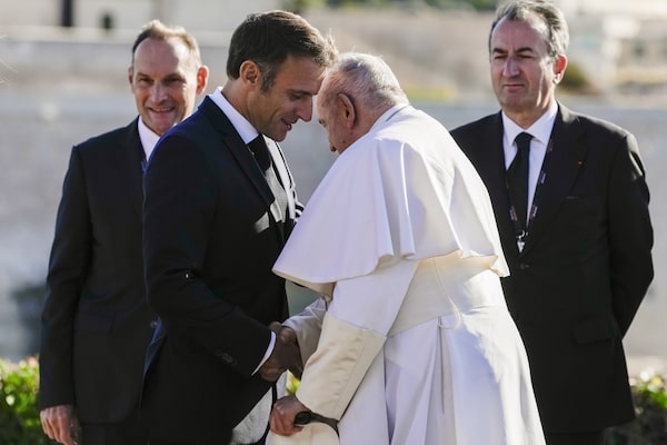 Pope Francis is welcomed by French President Emmanuel Macron as arrives at the final session of the "Rencontres Mediterraneennes" meeting at the Palais du Pharo, in Marseille, France, Sept. 23, 2023.Alessandra Tarantino/The Associated Press