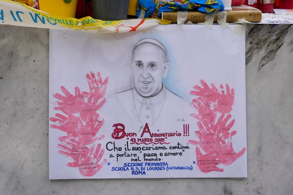 A poster depicting Pope Francis reading 'happy anniversary' is seen in front of the Agostino Gemelli Polyclinic, in Rome, on March 13.Andrew Medichini/The Associated Press