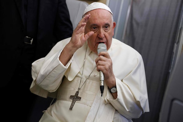Pope Francis speaks during a news conference aboard the papal plane on his flight back after visiting Canada on July 29.GUGLIELMO MANGIAPANE/AFP/Getty Images