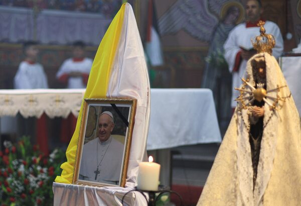 A portrait of Pope Francis is displayed during a Mass at the Holy Family Church, in Gaza City, on April 21.Dawoud Abu Alkas/Reuters