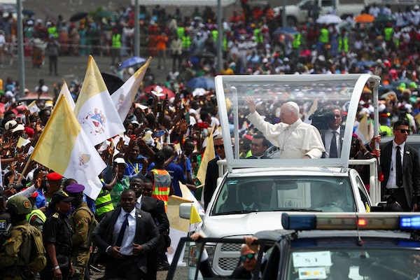 Pope Leo XIV greets people as he arrives to hold a holy Mass near Japoma Stadium in Douala, Cameroon on Friday.Guglielmo Mangiapane/Reuters