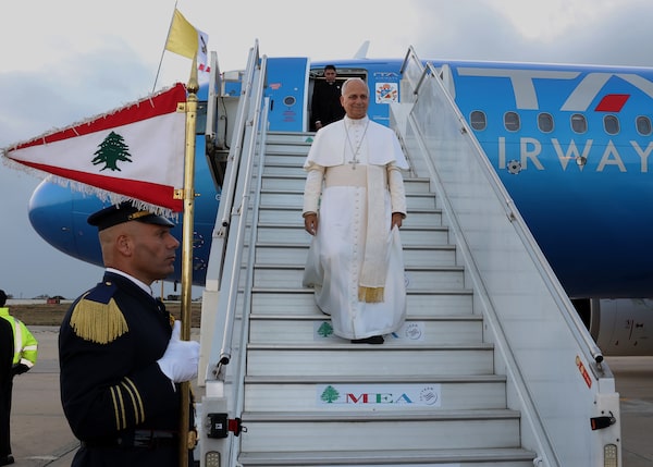 Pope Leo steps down from his plane upon his arrival at Beirut's international airport, on Sunday.Lebanese Presidency Press Office/The Associated Press