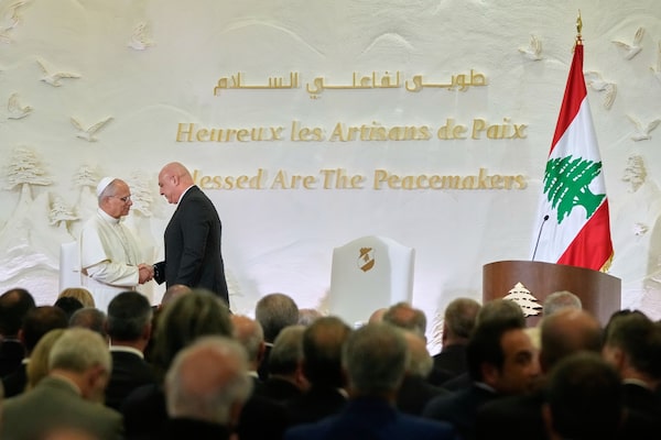 Lebanese President Joseph Aoun, right, shakes hands with Pope Leo XIV during a welcome ceremony at the presidential palace in Baabda, east of Beirut, Lebanon, on Sunday.Hassan Ammar/The Associated Press