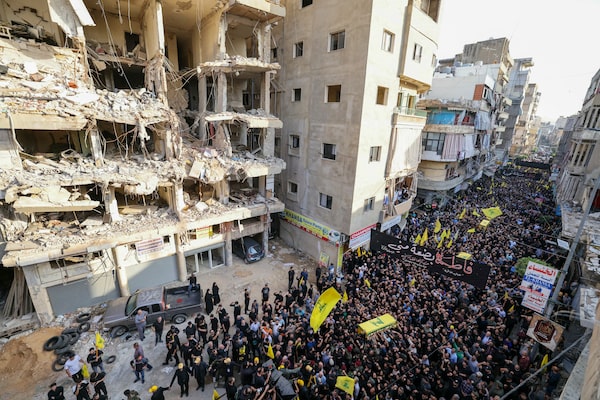 Mourners carry the coffin of top Hezbollah chief Haytham Ali Tabatabai and others killed in an Israeli strike a day earlier, during their funeral in Beirut's southern suburbs on Nov. 24.ANWAR AMRO/AFP/Getty Images