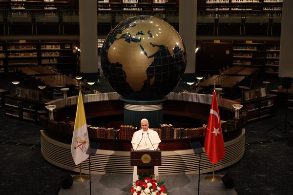 Pope Leo XIV gives a speech during a cultural program in the library of the Presidential Palace in Ankara, Turkey.Chris McGrath/Getty Images