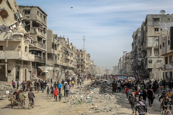Palestinians gather in a street as humanitarian aid is airdropped in Gaza City on March 1.-/Getty Images