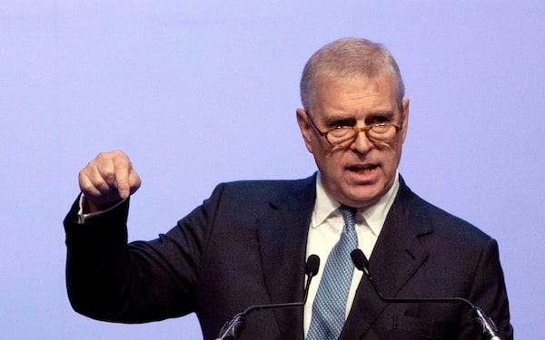 In this file photo dated Sunday, Nov. 3, 2019, Britain's Prince Andrew delivers a speech during the ASEAN Business and Investment Summit (ABIS) in Nonthaburi, Thailand.The Associated Press