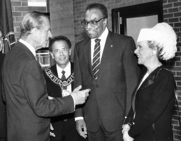 March 14, 1989: At North York City Hall, Prince Philip speaks with Ontario lieutenant-governor Lincoln Alexander, along with mayor Mel Lastman, second from left, and his wife, Marilyn.James Lewcun/The Globe and Mail