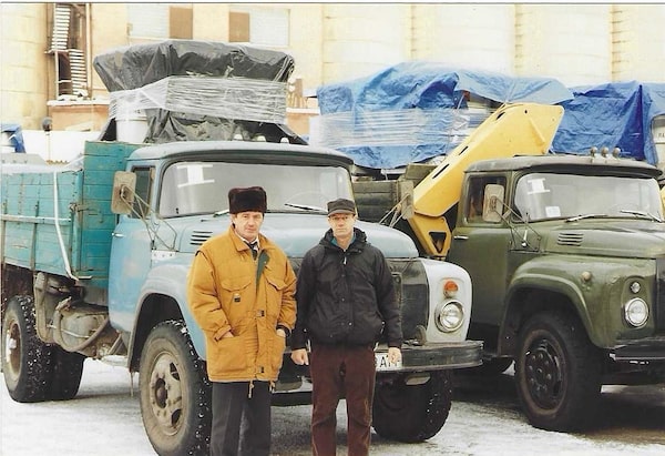 Andy Weber and the head of security for the Ulba Metallurgical Plant stand near the trucks loaded with the HEU.Andy Weber/Supplied