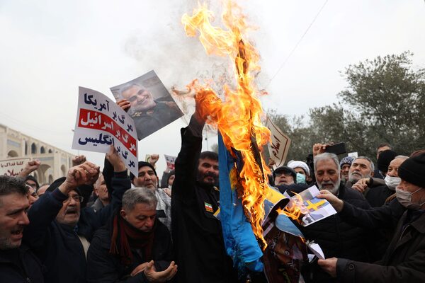 Protesters in Tehran, Iran burn the Swedish flag during a Jan. 27 protest to denounce the recent desecration of the Quran by far-right activists in Sweden.WANA NEWS AGENCY/Reuters