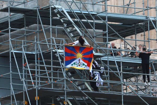 A protester holds a Tibetan flag during a demonstration at the Acropolis Propylaea, in Athens, Greece, on Oct. 17, 2021.ELIAS MARCOU/Reuters