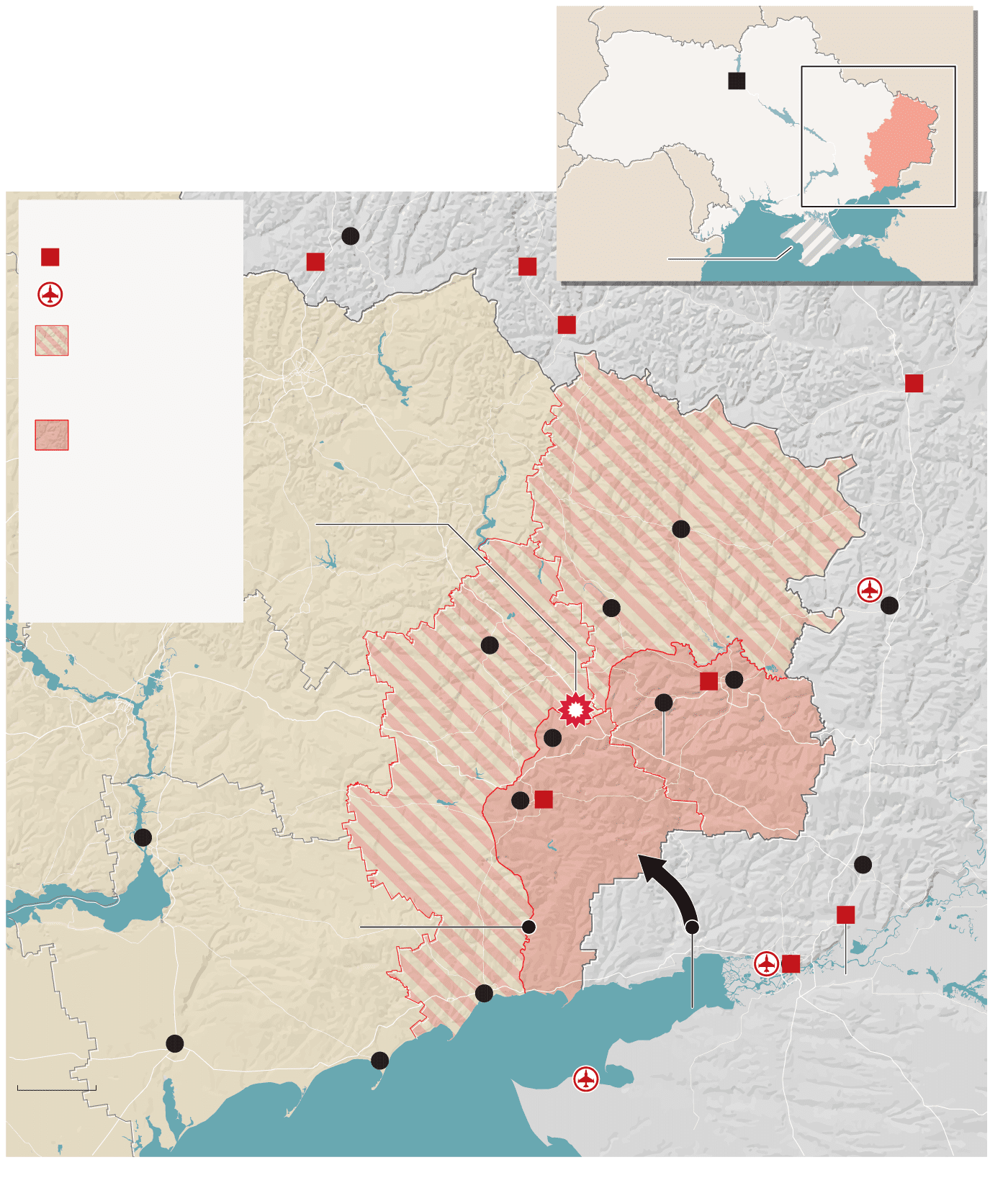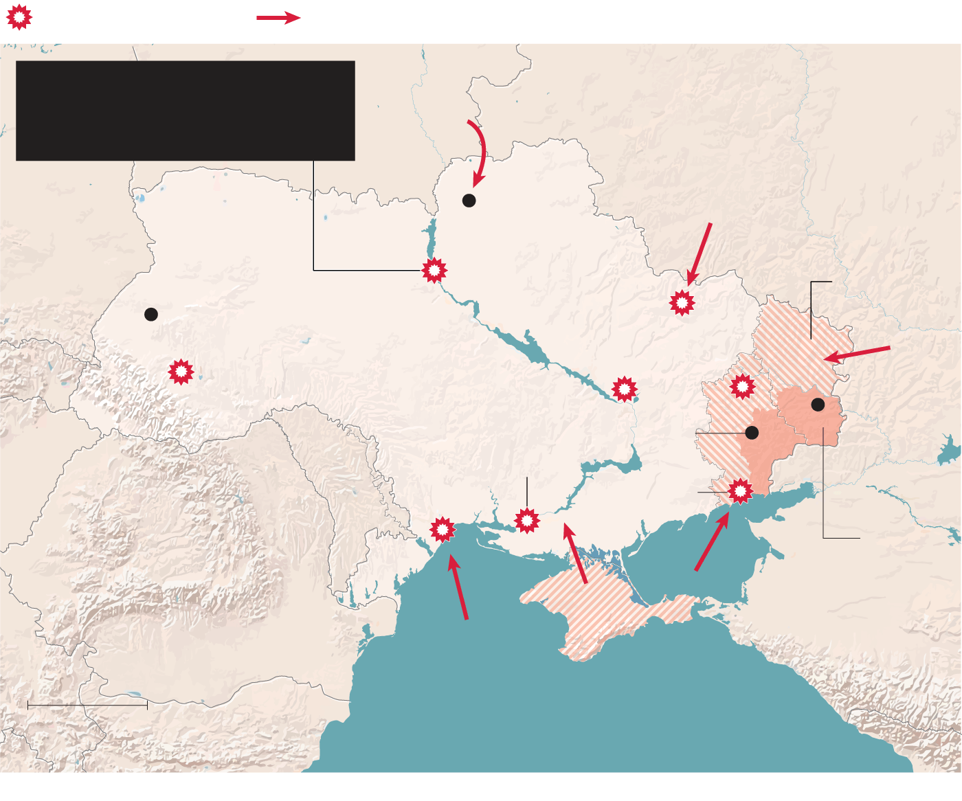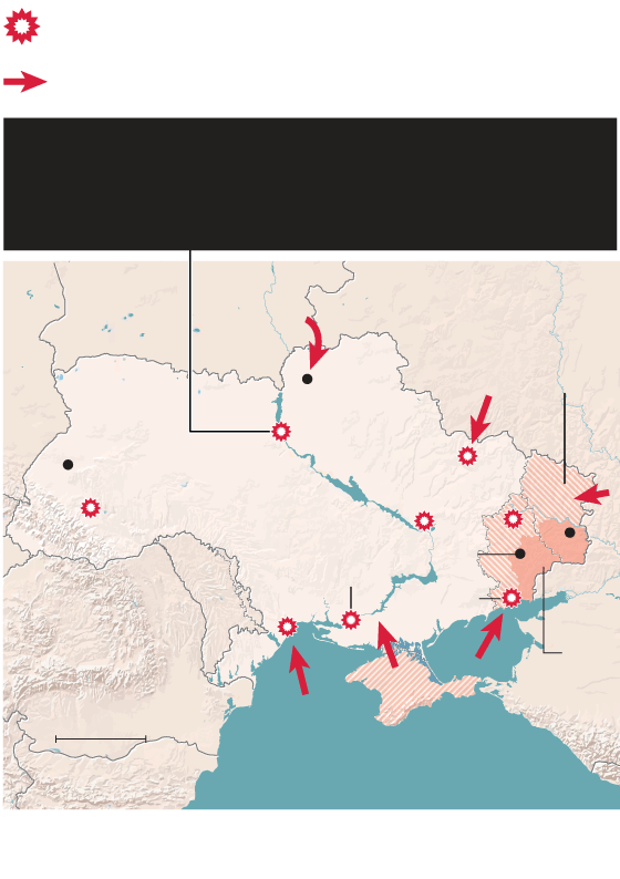 This map shows contested regions of Ukraine, areas held by pro-Russian separatists or Russian troop incursions.