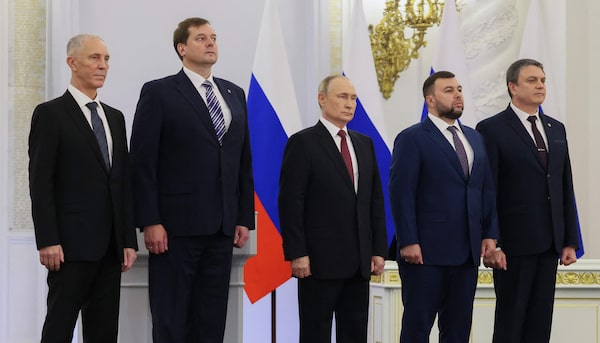 From the left, the Moscow-appointed heads of Kherson region Vladimir Saldo and Zaporizhzhia region Yevgeny Balitsky, Russian President Vladimir Putin, Donetsk separatist leader Denis Pushilin and Lugansk separatist leader Leonid Pasechnik, after signing treaties illegally annexing four regions of Ukraine Russian troops occupy, at the Kremlin in Moscow on Sept. 30.MIKHAIL METZEL/AFP/Getty Images