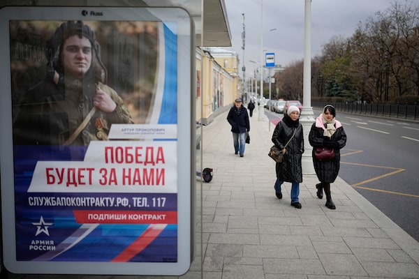 Pedestrians walk past a bus stop with an advertising billboard which promotes contract military service in the Russian army with words in Russian "The Victory will be ours!", in Moscow on Nov. 19.Alexander Zemlianichenko/The Associated Press