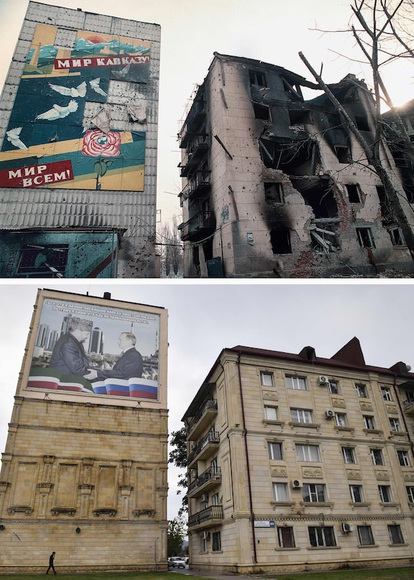 At top, a sign in Grozny says 'peace to Caucasus, peace to everybody!' in 1995, when Mr. Yeltsin was still in power; at bottom, a sign at the same block in 2019 features Mr. Putin and former Chechen president Akhmad Kadyrov.ALEXANDER NEMENOV/AFP/Getty Images