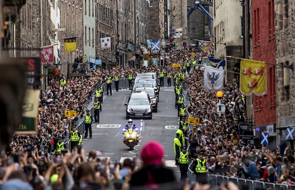 Members of the public gather along the Royal Mile to watch the hearse carrying the coffin of Queen Elizabeth, as it is driven through Edinburgh towards the Palace of Holyroodhouse, on Sept. 11.JAMIE WILLIAMSON/AFP/Getty Images