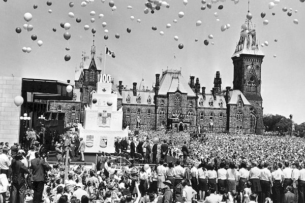 Canada's centennial year, 1967, gave the Queen a busy schedule: hundreds of balloons are released at Parliament Hill after she cut a 30-foot-high birthday cake on Canada Day.