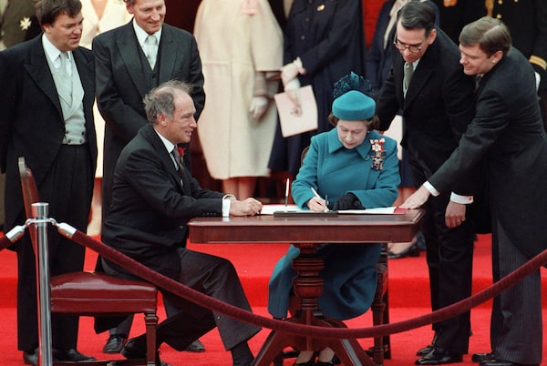 The Queen, watched by Pierre Trudeau and assorted politicians, signs the Constitution Act into law, making Canada's founding document a purely Canadian rather than British law for the first time.Ron Poling/The Canadian Press