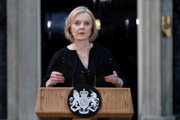 British Prime Minister Liz Truss arrives to deliver a speech outside 10 Downing Street after Queen Elizabeth died.PETER NICHOLLS/Reuters