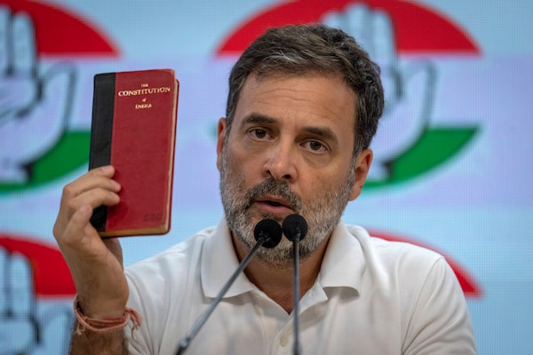 Congress Party leader Rahul Gandhi holds a copy of the Indian Constitution as he addresses a press conference at the party headquarters in New Delhi on June 4.Altaf Qadri/The Associated Press