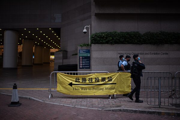 Police officers stand guard outside a polling station on Dec. 19, 2021, in Hong Kong.Louise Delmotte/Getty Images