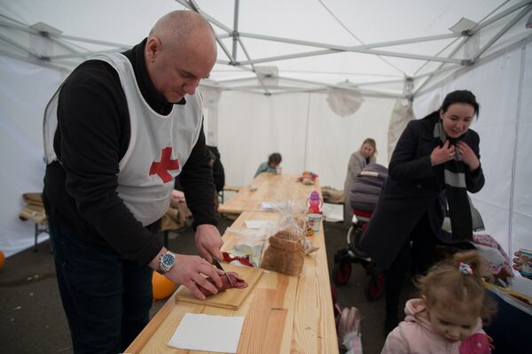A volunteer from the Slovak Red Cross organization in Snina cuts salami in a tent set up for refugees on Feb. 26.Zuzana Gogova/Getty Images