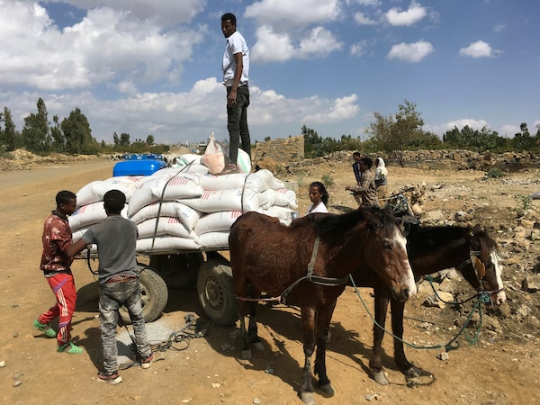 People affected by the conflict in Tigray load food aid provided by USAID and Catholic Relief Services onto a donkey cart to be tansported to their home, outside Mekele, Ethiopia, on on Jan. 12, 2021.Catholic Relief Services/The Associated Press