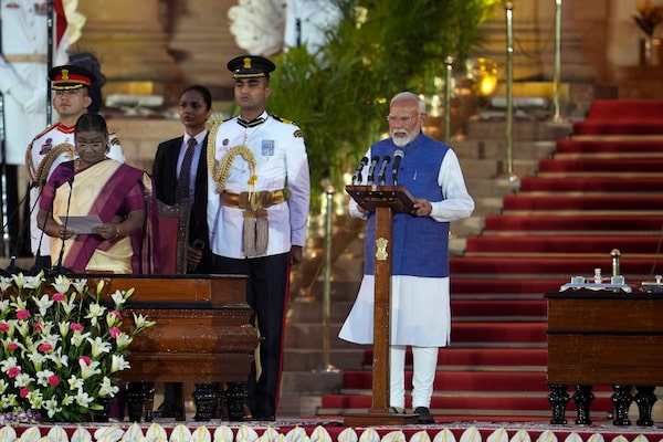 Narendra Modi, right, is sworn-in as the Prime Minister of India by President Draupadi Murmu, left, at the Rashtrapati Bhawan, in New Delhi, India, on June 9.Manish Swarup/The Associated Press
