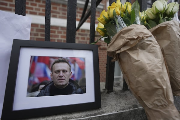 Flowers and a photo are left opposite the Russian Embassy in London on Feb. 16.Kin Cheung/The Associated Press