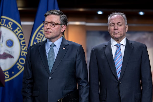 Speaker of the House Mike Johnson, R-La., left, with Majority Leader Steve Scalise, R-La., meets with reporters after presenting his final version of an interim pending bill to his caucus, at the Capitol in Washington, on Dec. 17.J. Scott Applewhite/The Associated Press