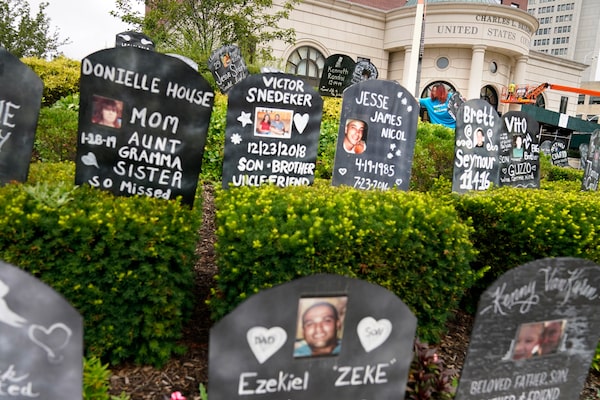 Jayde Newton helps to set up cardboard gravestones with the names of victims of opioid abuse outside the courthouse where the Purdue Pharma bankruptcy is taking place in White Plains, N.Y., on Aug. 9.Seth Wenig/The Associated Press