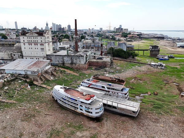 A drone view shows boats stranded on the Rio Negro as the river reached its lowest point in its history during the most widespread drought the country has experienced since records began in 1950, in Manaus, on Oct. 4.Bruno Kelly/Reuters