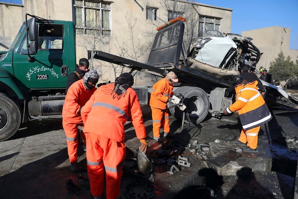 Afghan security personnel and municipality workers remove a damaged vehicle after a roadside bomb attack in Kabul, on Dec. 22, 2020.Rahmat Gul/The Associated Press