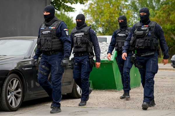 Gendarmes outside the residence of internet influencer Andrew Tate during an early morning police search raid, on the outskirts of Bucharest, Romania, on Aug. 21.Vadim Ghirda/The Associated Press