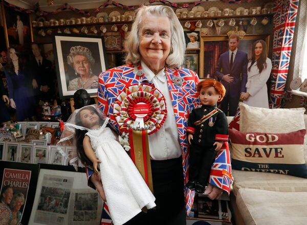 Royal fan Margaret Tyler poses with her dolls called Harry and Meghan and her collection of royal memorabilia that decorates her Bed & Breakfast establishment in London.Frank Augstein/The Associated Press