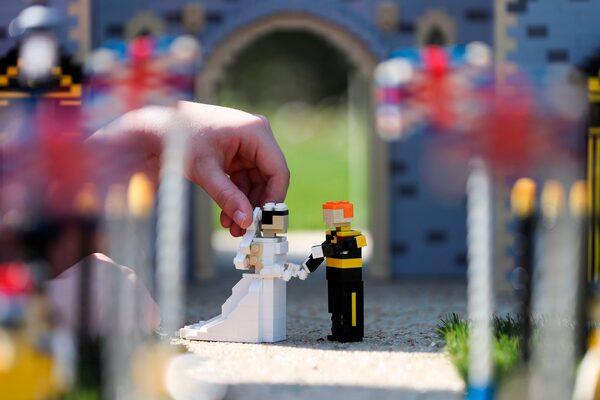 At Legoland in Windsor, Lego-brick models of Prince Harry and Meghan Markle face their wedding guests in front of Windsor Castle. The real royal wedding takes place May 19 at noon local time (7 a.m. ET).DANIEL LEAL-OLIVAS/Getty Images