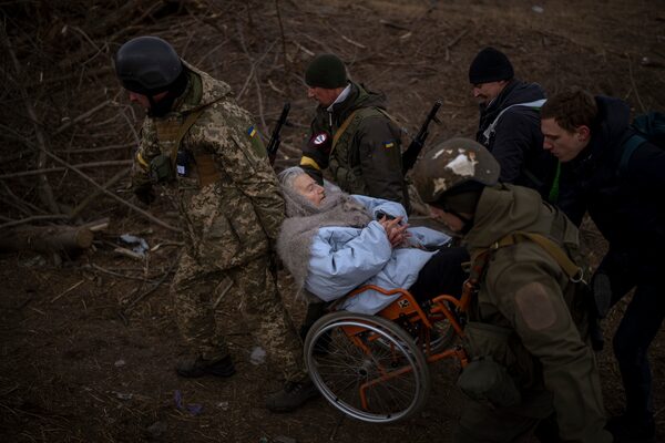 Ukrainian soldiers carry a woman in a wheelchair as the artillery echoes nearby, while people flee Irpin on the outskirts of Kyiv.Emilio Morenatti/The Associated Press