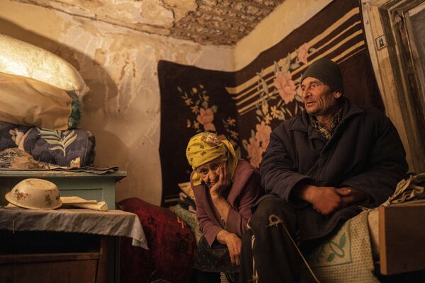 Nina Gonchar, 93, and her son Mykola Gonchar, 58, sit inside their house which was mostly destroyed by Russian forces in the recently retaken village of Bogorodychne, Ukraine, on Jan. 7.Evgeniy Maloletka/The Associated Press