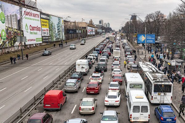 Evacuees stream out of town on a main highway in Kyiv on Feb. 24.ANTON SKYBA/The Globe and Mail