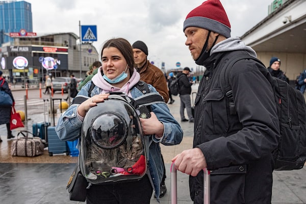 “We have so much doubt about what to do,” said Alexandra, a 25-year-old theatre actress who asked that her family name not be used out of fear that Kyiv and Ukraine could soon be occupied by a hostile force. “Should we stay and fight for Kyiv, or should we be with our parents?” she asked aloud as she stood outside the bustling train station on Thursday with the couple’s cat, Plonya, strapped to her in a clear plastic backpack.