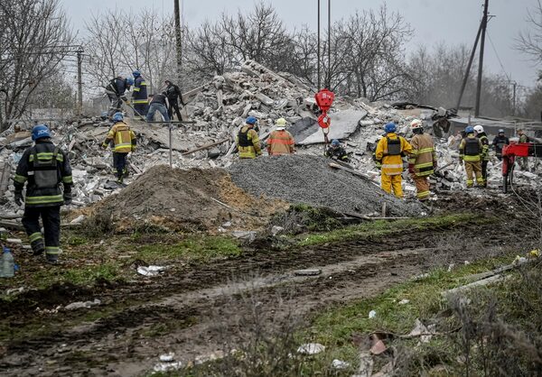 Rescuers work at a site of a residential building destroyed by a Russian missile strike in the town of Vilniansk, Ukraine, on Nov. 17.STRINGER/Reuters