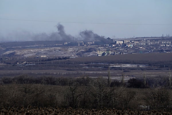 Smoke billows during fighting between Ukrainian and Russian forces in Soledar, Donetsk region, Ukraine on Jan. 11, 2023.Libkos/The Associated Press