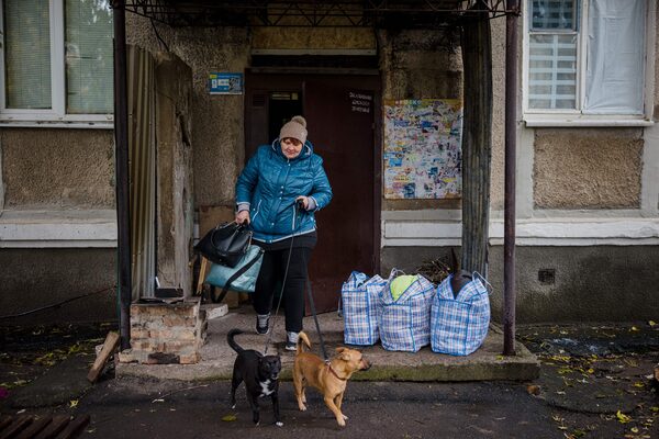 A woman brings out her two dogs to evacuate from the town of Bakhmut in Donetsk region, on Oct. 25.DIMITAR DILKOFF/AFP/Getty Images