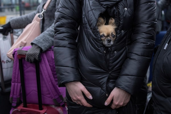 A refugee holds her dog as they queue for trains to Poland following the Russian invasion of Ukraine, at the train station in Lviv, Ukraine, March 7, 2022.MARKO DJURICA/Reuters