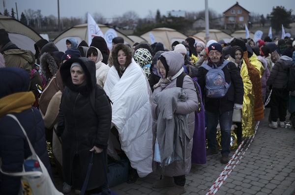 Refugees wait in a crowd for transportation after fleeing from the Ukraine and arriving at the border crossing in Medyka, Poland, Monday, March 7, 2022.Markus Schreiber/The Associated Press