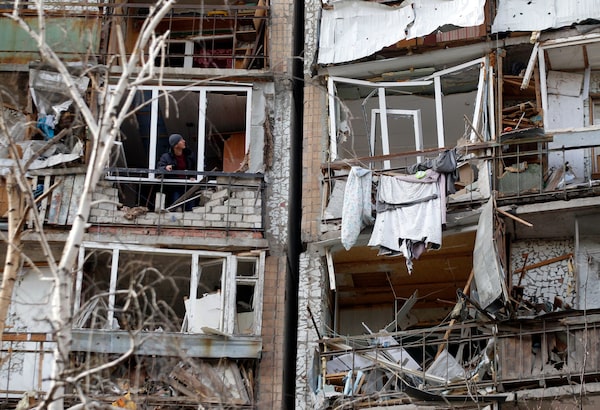 A resident looks out of the destroyed front of a room in a multi-storey building that was badly damaged by a Russian missile explosion after it was shot down by Ukrainian air defence, in Kramatorsk on March 7, 2022.ANATOLII STEPANOV/AFP/Getty Images