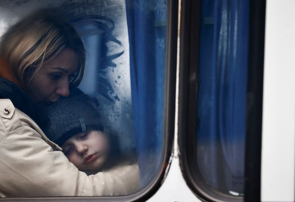 A woman and her son are seen through a bus window as they arrive at a temporary accommodation centre, after fleeing Russian invasion of Ukraine, in Korczowa, Poland, March 5, 2022.YARA NARDI/Reuters