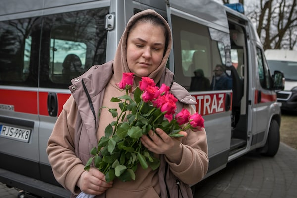 Natali Ticegko holds a bouquet of roses outside a refugee centre in a village hall in Krowica Sama, Poland.Anna Liminowicz/The Globe and Mail